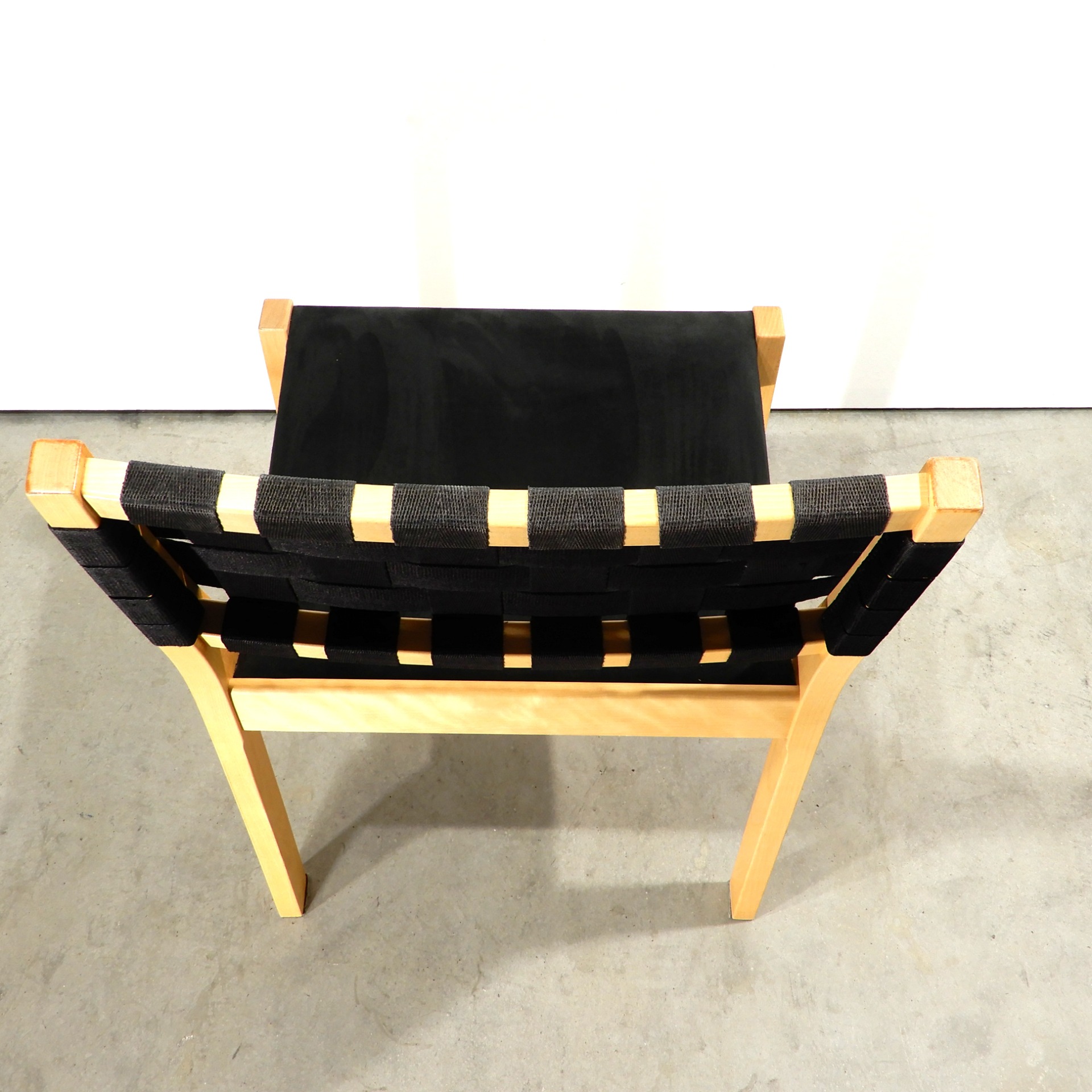 Istuinosan verhoiluna musta Alcantara kangas. Selkäosassa musta tuolivyö. Puuosat lakattua koivua. Yleiskuva siisti, käytönjälkiä kankaissa, puuosissa.