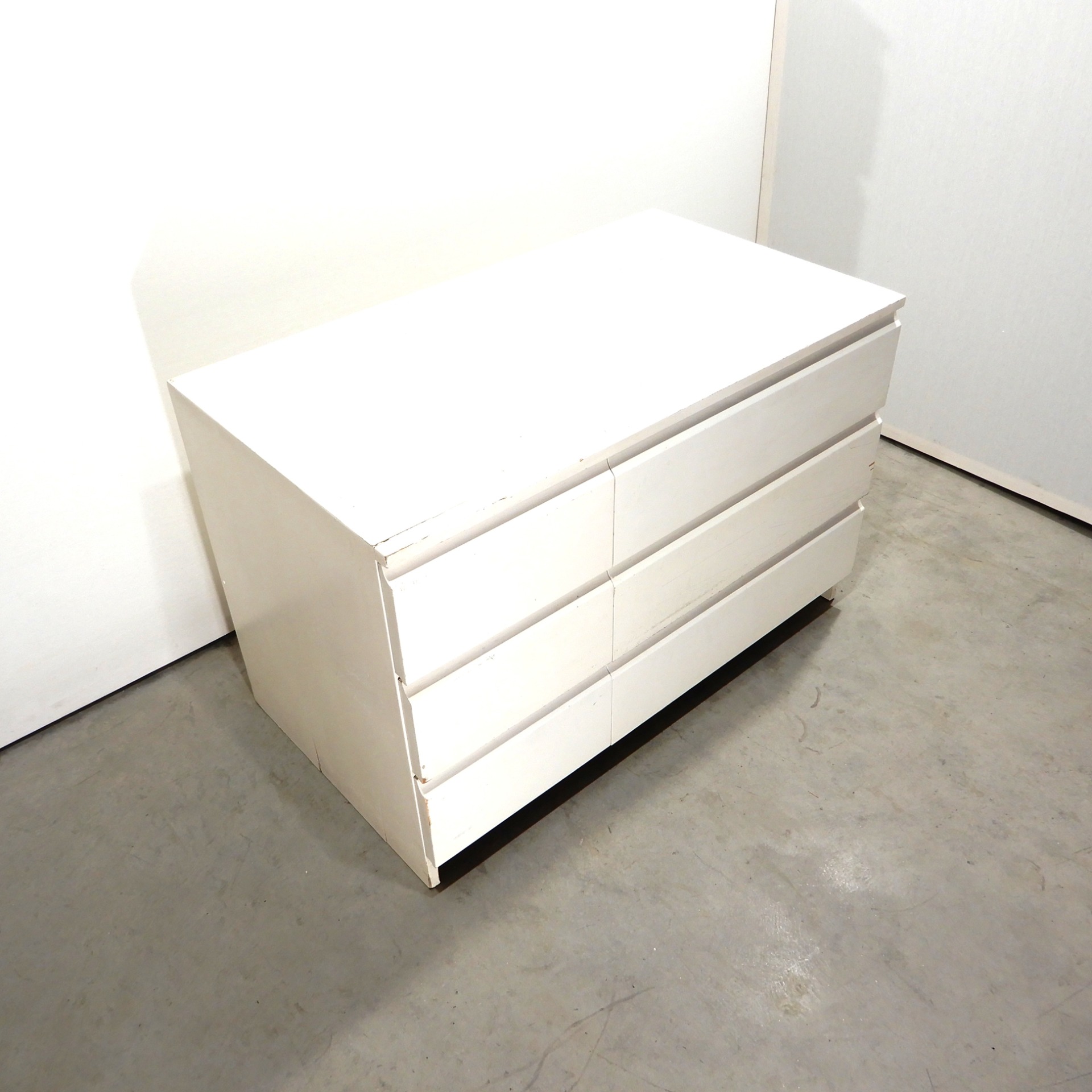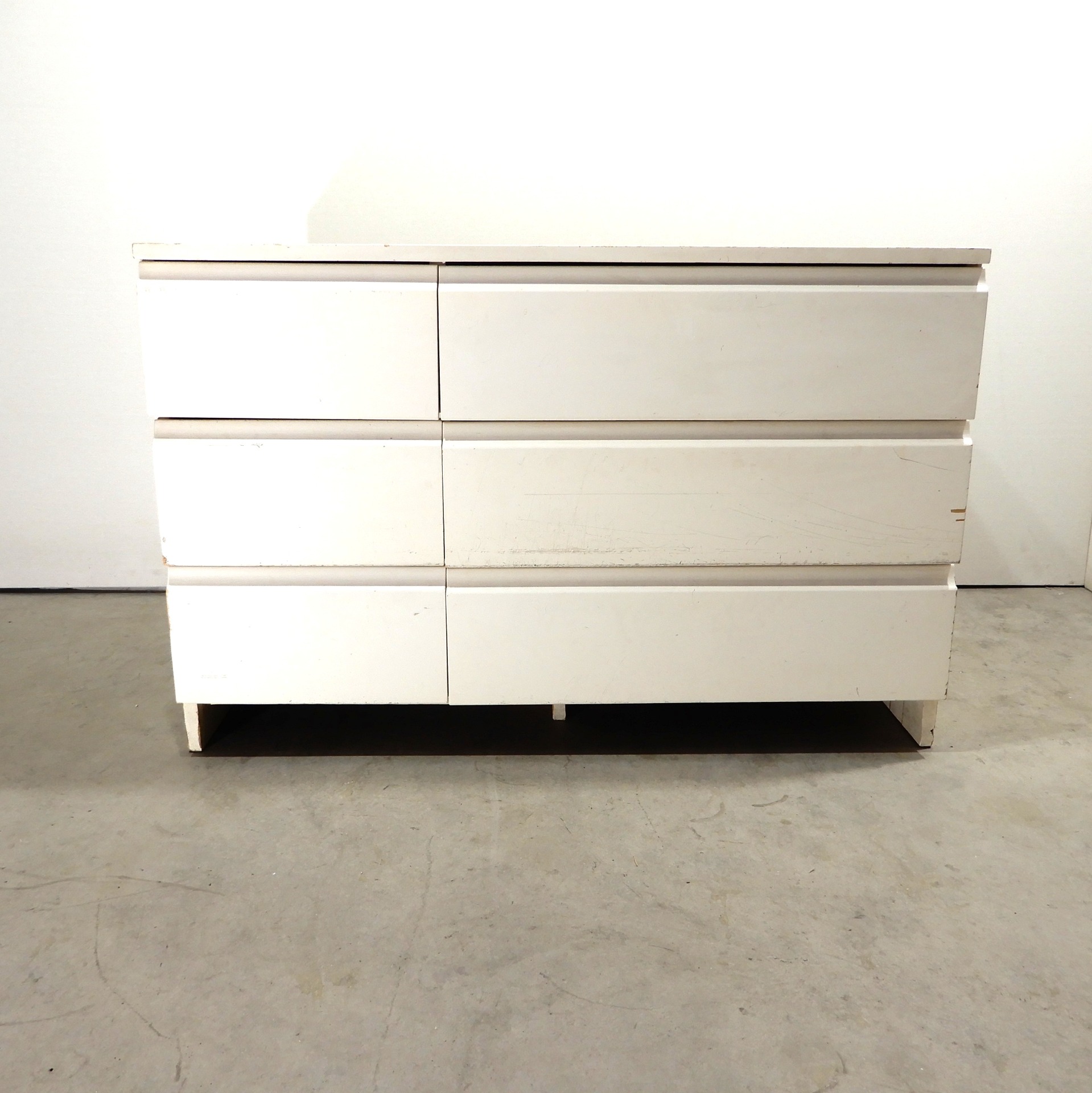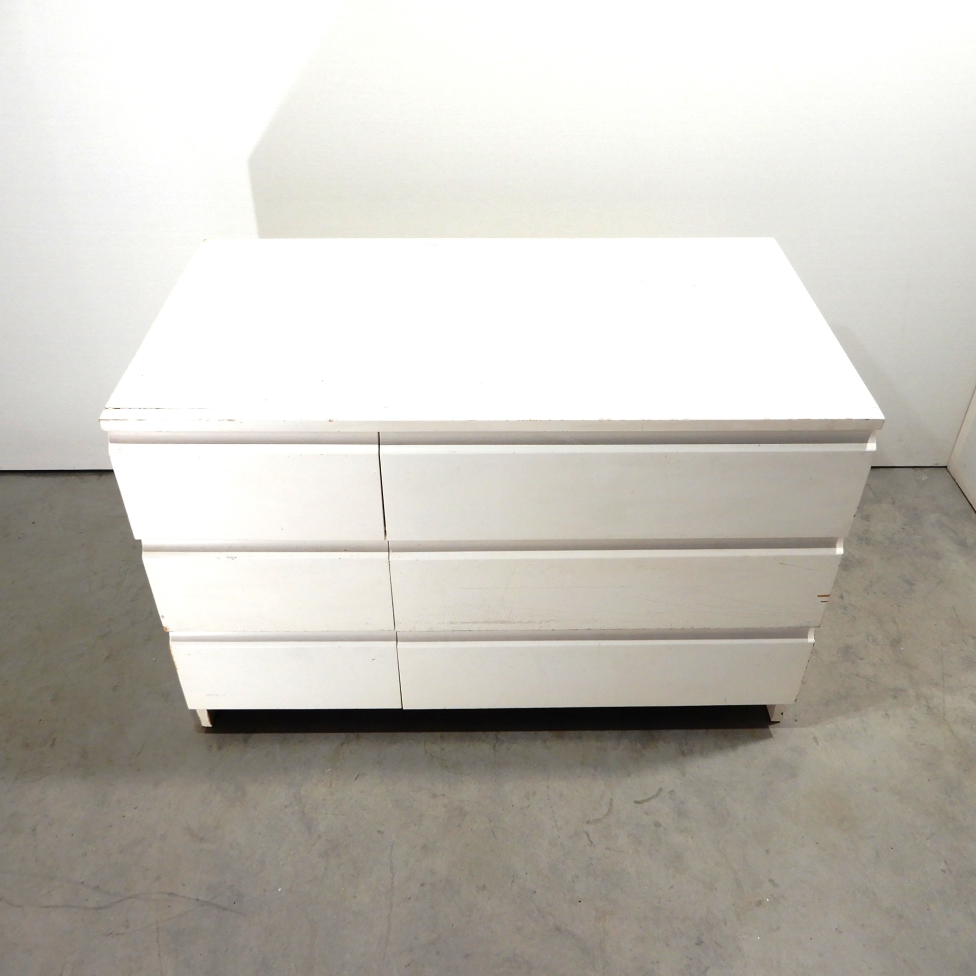 Valkoiseksi maalattua koivua. Kuudella vetolaatikolla, ylimmissä laatikoissa liukulokerikot. Maalipinnassa / puuosissa selkeää kulumaa, halkeamia.