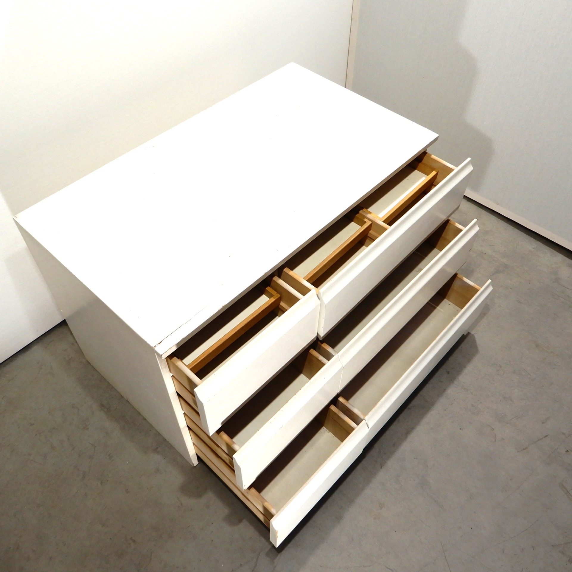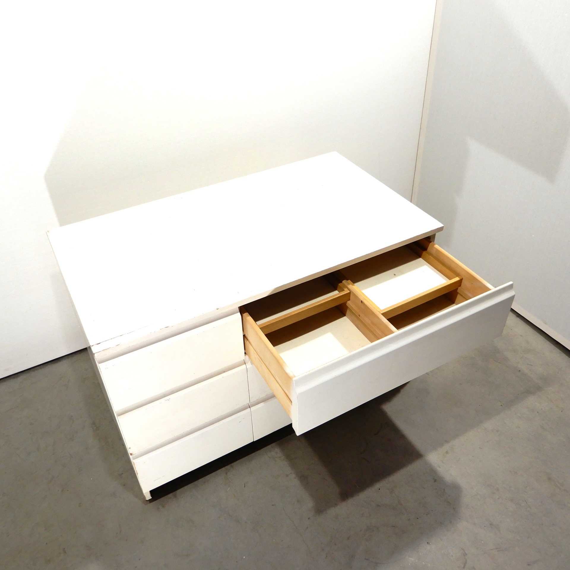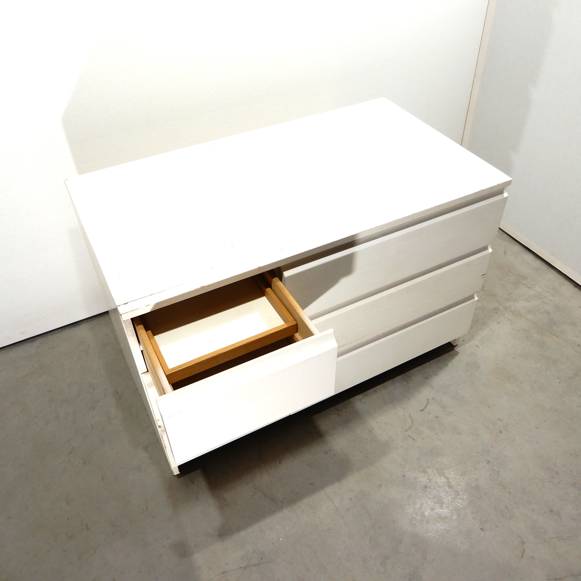 Valkoiseksi maalattua koivua. Kuudella vetolaatikolla, ylimmissä laatikoissa liukulokerikot. Maalipinnassa / puuosissa selkeää kulumaa, halkeamia.