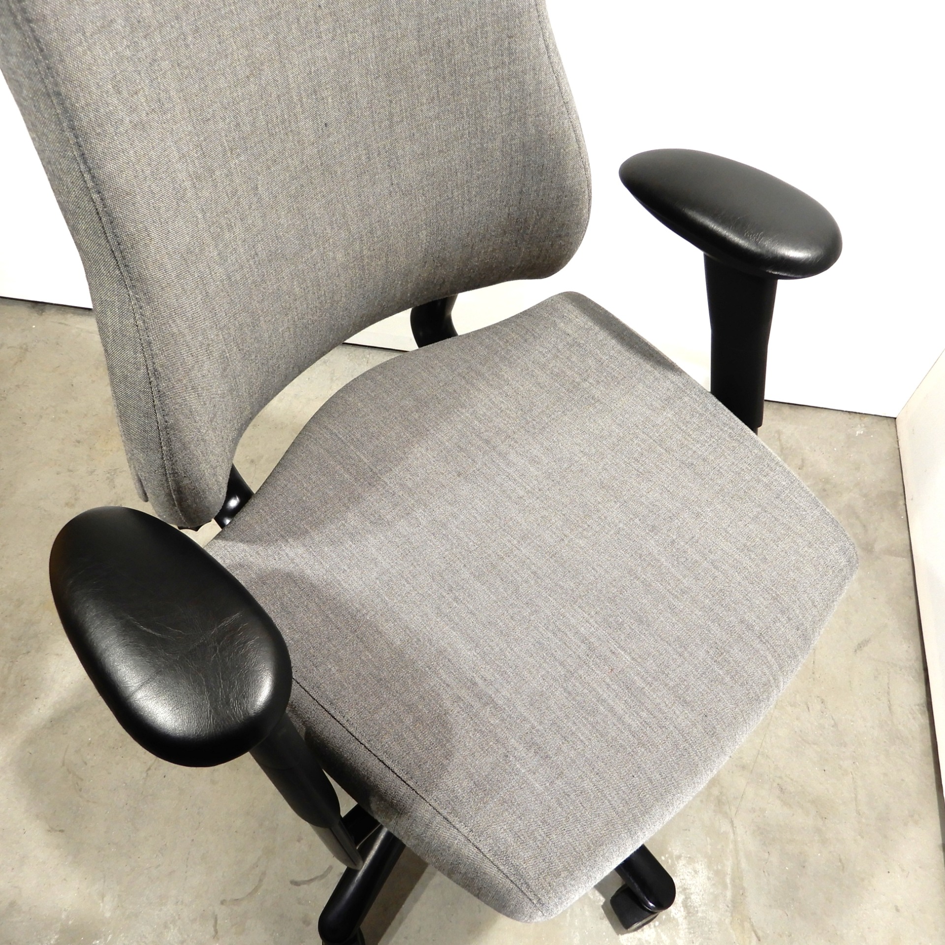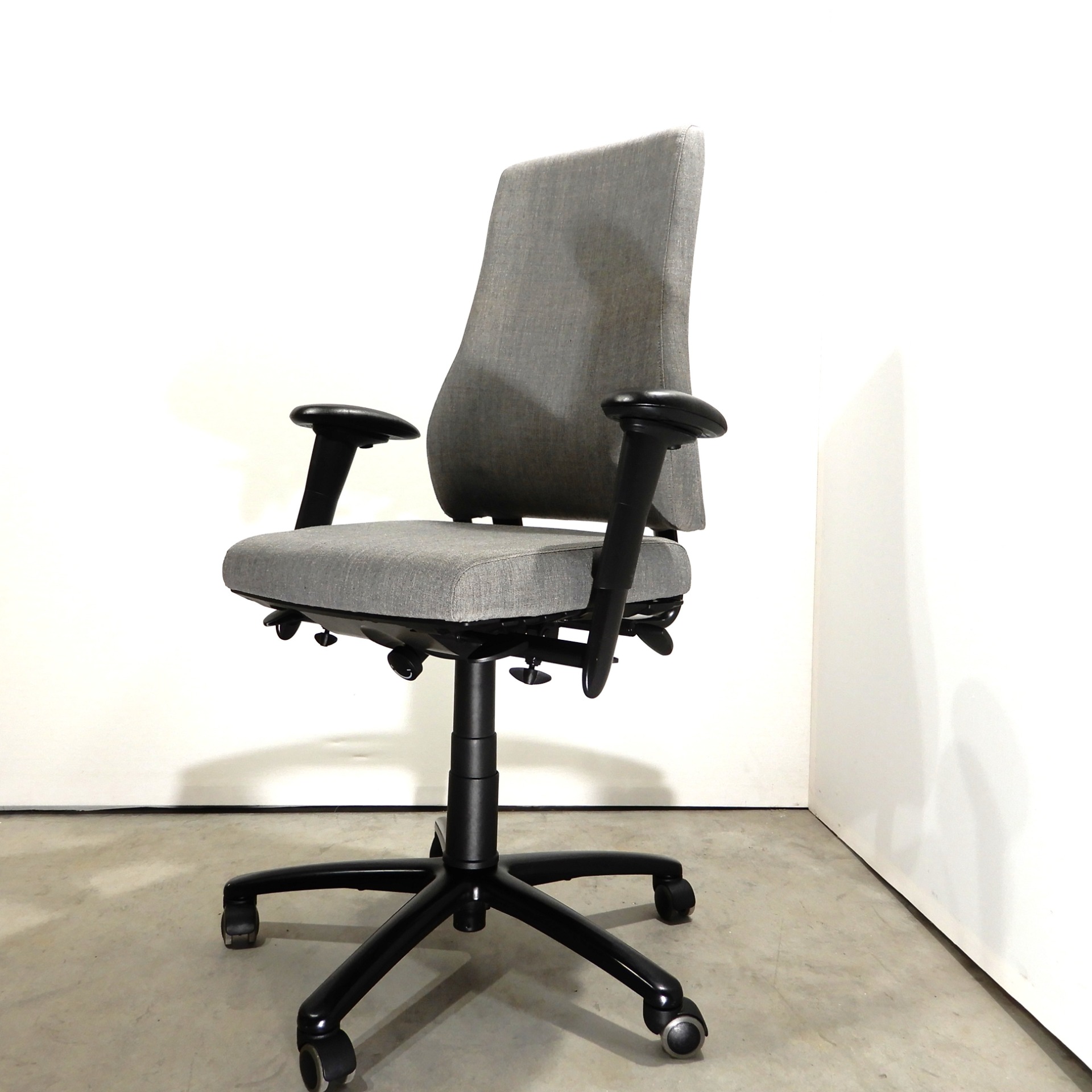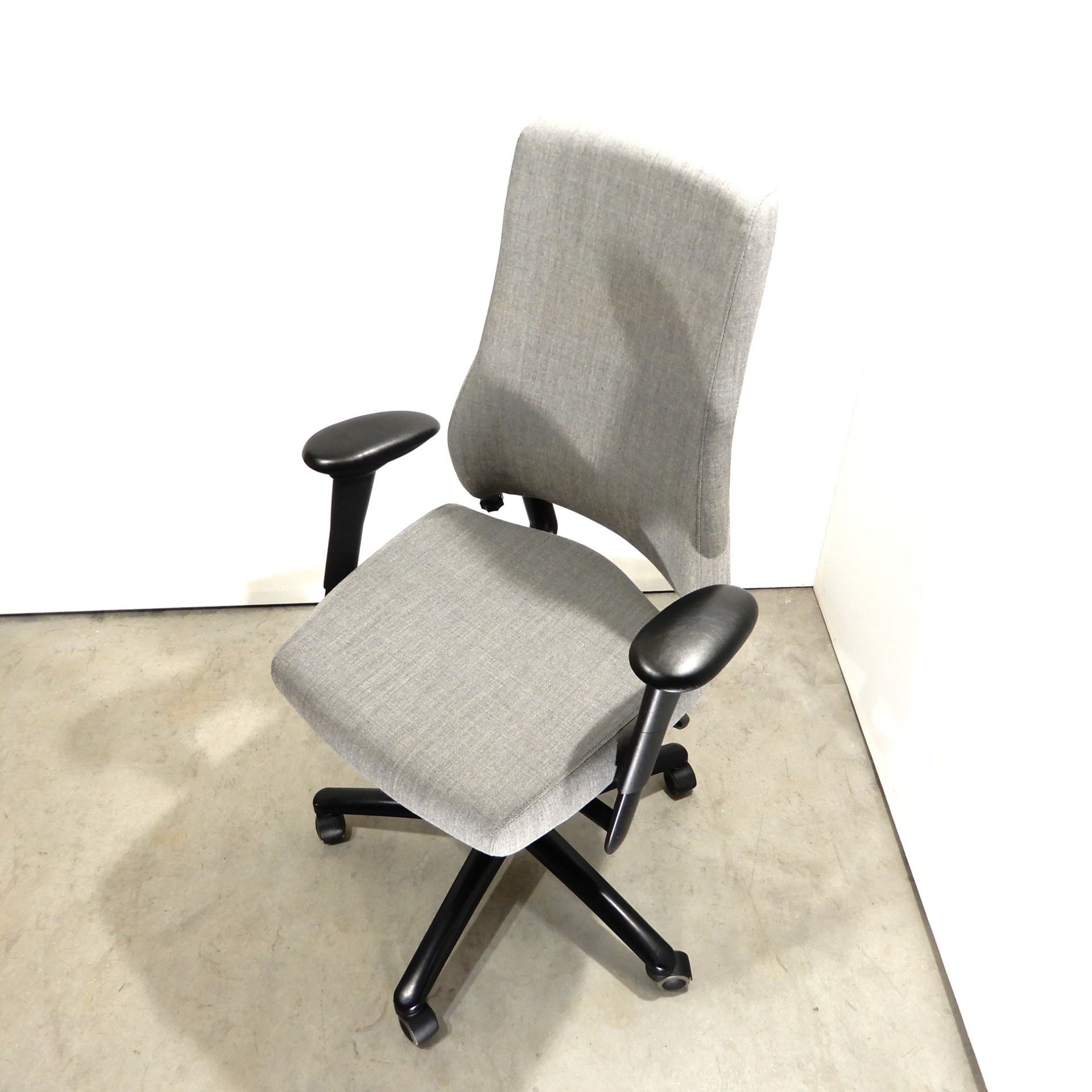 Uudelleenverhoiltu vaaleanharmaalla Remix kankaalla. Säädöt, istuimen syvyys ja korkeus 44/58 cm, keinumekanismi lukituksella. Selän kallistuksen ja ristiseläntuen säätö. Käsinojien leveys, korkeus ja kannen säätö. Musta ristikko pyörillä, vähäisiä käytönjälkiä.