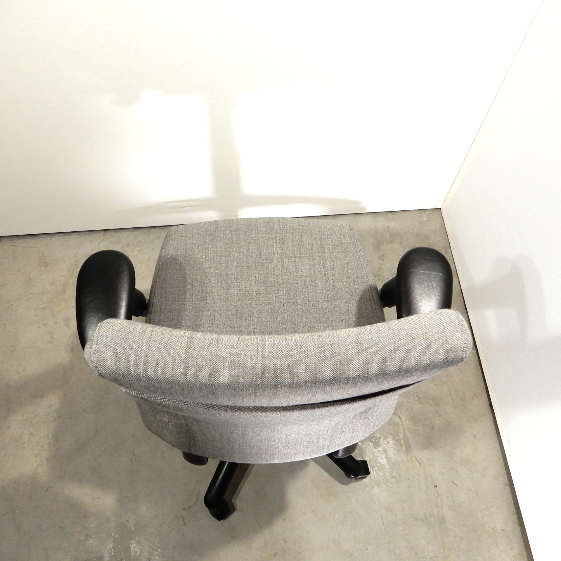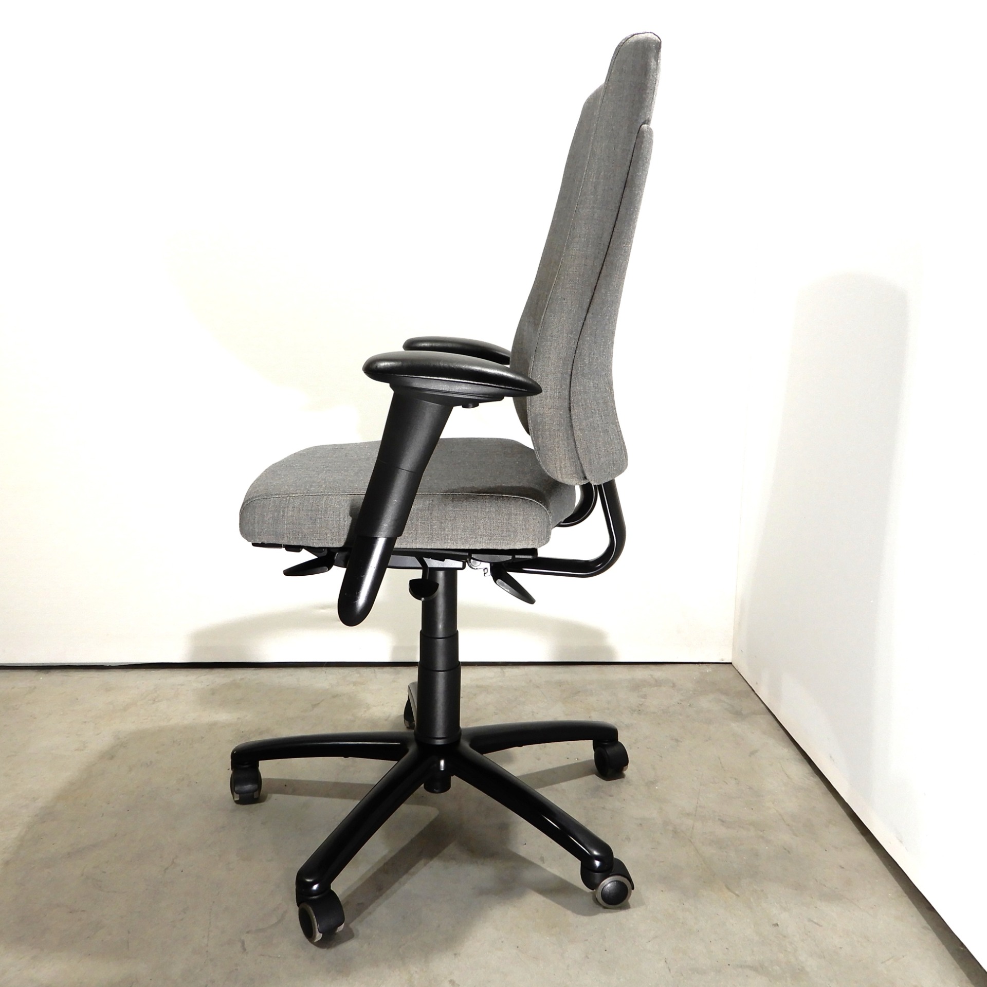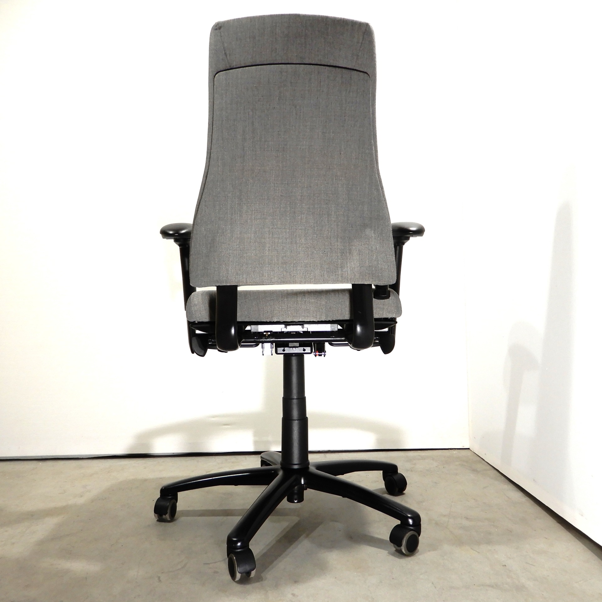 Uudelleenverhoiltu vaaleanharmaalla Remix kankaalla. Säädöt, istuimen syvyys ja korkeus 44/58 cm, keinumekanismi lukituksella. Selän kallistuksen ja ristiseläntuen säätö. Käsinojien leveys, korkeus ja kannen säätö. Musta ristikko pyörillä, vähäisiä käytönjälkiä.